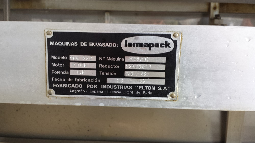 Modelo: MCK 350, Motor 2005, Potencia 0.5 Kw, Tension 220/380, Fecha de fabricación 29-7-83, Formato de paquete son 800 x 200 mm.